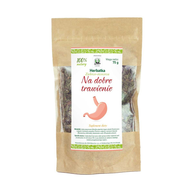 Herbatka ziołowo-owocowa Na Dobre Trawienie w naturalny sposób wspomaga procesy trawienne. W skład herbatki wchodzą: mięta pieprzowa, owoc kopru włoskiego, liść tymianku pospolitego, liść rozmarynu lekarskiego, oraz biedrzeniec anyż.