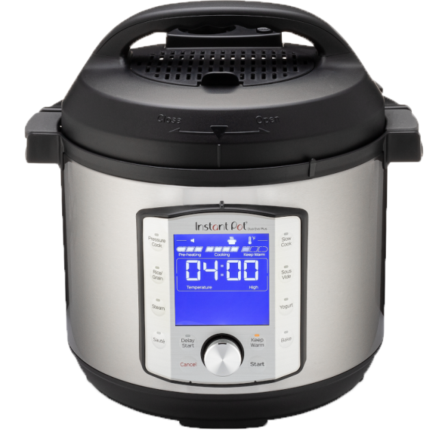 Instant Pot Duo Evo Plus ma również podświetlany wyświetlacz, taki jak Duo Plus, ale jego ustawienia są zmieniane za pomocą pokrętła, które pozwala wybierać spośród gotowych ustawień w inteligentnym programie i dostosowywać ustawienia gotowania. Nie zapomnij nacisnąć przycisku start po dokonaniu wyboru, w przeciwieństwie do modelu Duo Plus, który używa przycisków do wyboru ustawień gotowania i rozpoczyna automatyczne gotowanie po kilku sekundach.