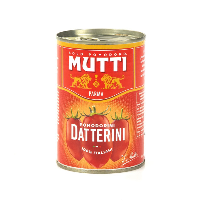 Małe i soczyste, słodkie pomidory daktylowe Mutti. Gwarancja 100% włoskich upraw. Wolne od GMO.