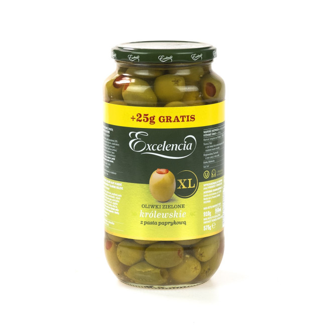 Oliwki zielone królewskie XL, nadziewane pastą paprykową, w zalewie z dodatkiem soli morskiej. Oliwki Gordal to najszlachetniejsze z oliwek. Ich jakość podkreśla ręczny zbiór w rejonie Sevilli. Śródziemnomorskie słońce nadaje im łagodny, owocowy smak oraz świeży bukiet. Bez dodatku GMO i pestycydów. Posiadają certyfikat Koszerności oraz Halal.