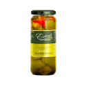 To unikalna propozycja najszlachetniejszych oliwek odmiany Gordal, w zalewie z czerwoną papryką, czosnkiem i szczyptą oregano, dla najbardziej wymagających konsumentów. Wysoką jakość produktu podkreśla ich ręczny zbiór.