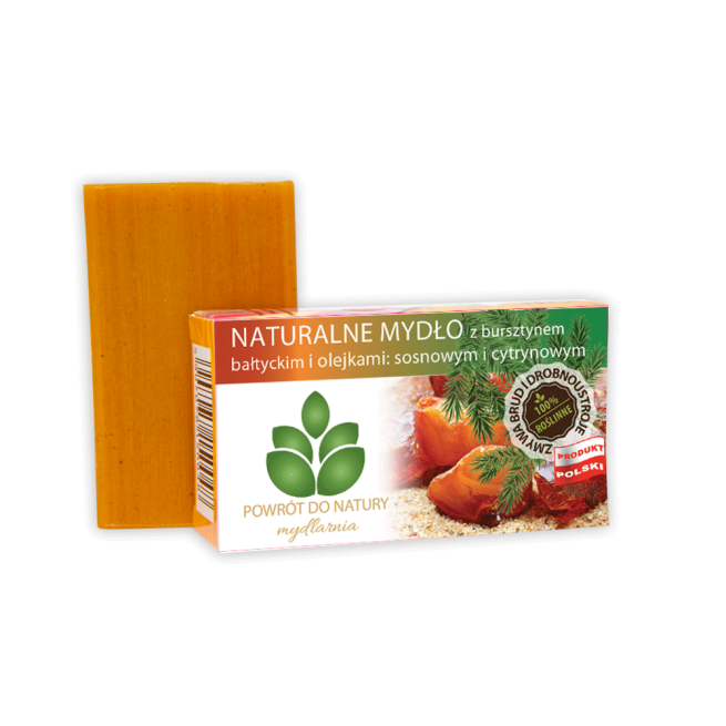 Bursztyn bałtycki pochodzi z żywicy drzew sosnowatych (Pinus succinifera) lub sośnicowatych (Sciadopityaceae). Rosły one na terenach Północnej Europy ponad 320 milionów lat temu. Żywica tworzyła się jako reakcja drzew` na zranienia lub zakażenia bakteryjne. Właściwości pielęgnujące i lecznicze bursztynu są związane z zawartością kwasu bursztynowego, a bursztyn bałtycki zawiera jego największą ilość (3 – 8% obj.). Kwas ten jest głównie na powierzchni bursztynu i ma dobry wpływ na regulację pracy tarczycy, schorzenia układu oddechowego oraz reumatyzm. Ta kopalniana żywica nagrzewa się pod wpływem dotyku i wydziela charakterystyczny zapach sosnowych olejków eterycznych. Bursztyn także pielęgnuje i odżywia skórę. Przyspiesza jej odnowę komórkową, jest naturalnym antyoksydantem, regeneruje i rozświetla. Mydło dzięki zawartości delikatnych drobinek bursztynu, posiada właściwości pilingujące. Posiada delikatny zapach naturalnych olejków: cytrynowego i sosnowego.