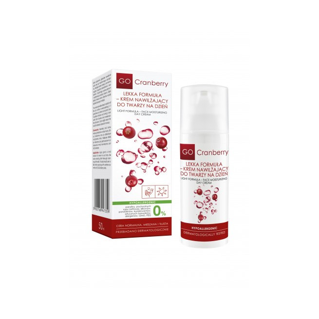 Krem nawilżający do twarzy na dzień GoCranberry o lekkiej formule to kosmetyk zapewniający skórze odpowiednich składników odżywczych bez nadmiernego obciążenia. Zapobiega nadmiernemu wydzielaniu się sebum, a dzięki swej konsystencji nadaje się pod makijaż (również mineralny).
