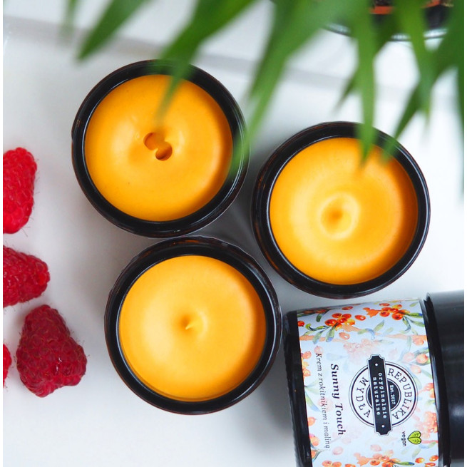 Wypełniony po brzegi zimnotłoczonymi olejami z rokitnika, malin i słonecznika oraz masłem Shea. Dzięki połączeniu delikatnych olejów krem nie powoduje zapychania porów, co czyni go idealnym kosmetykiem do każdego rodzaju skóry w tym suchej, popękanej czy dojrzałej. Dzięki zawartym kwasom regeneruje naskórek, np. po oparzeniach słonecznych. Mieszanka naturalnych ekstraktów botanicznych z maliny, wanilii, jabłka, jeżyny i winogrona odpowiada za niepowtarzalny zapach kremu i dodatkowo podnosi jego dobroczynne właściwości. Stosowane przez nas ekstrakty to najwyższej jakości wyciągi z kwiatów, liści, łodyg, nasion i owoców, pozyskiwane w fizyczny sposób bezpośrednio z różnych części roślin, dzięki czemu posiadają szereg zalet: są w pełni bezpieczne, nietoksyczne, bez parabenów i „fragrance free”.