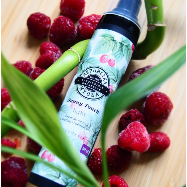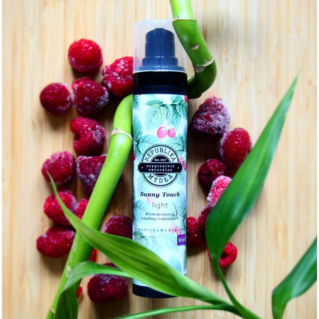 Krem do twarzy Sunny Touch Light to przede wszystkim nierafinowane oleje z czerwonej maliny i rokitnika. Bazą kosmetyku jest napar z nasion lnu. Krem zawiera ponadto witaminę B5 o działaniu przeciwzapalnym oraz witaminę E, która w połączeniu z biofermentem z bambusa pomaga odbudować naturalny kolagen. Słodki zapach zawdzięczamy owocowym ekstraktom botanicznym, m.in. z maliny i jeżyny.