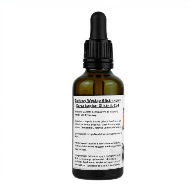 Składniki: Macerat Glistnikowy, Olejek Cbd, Indyjski Olej Rycynowy.