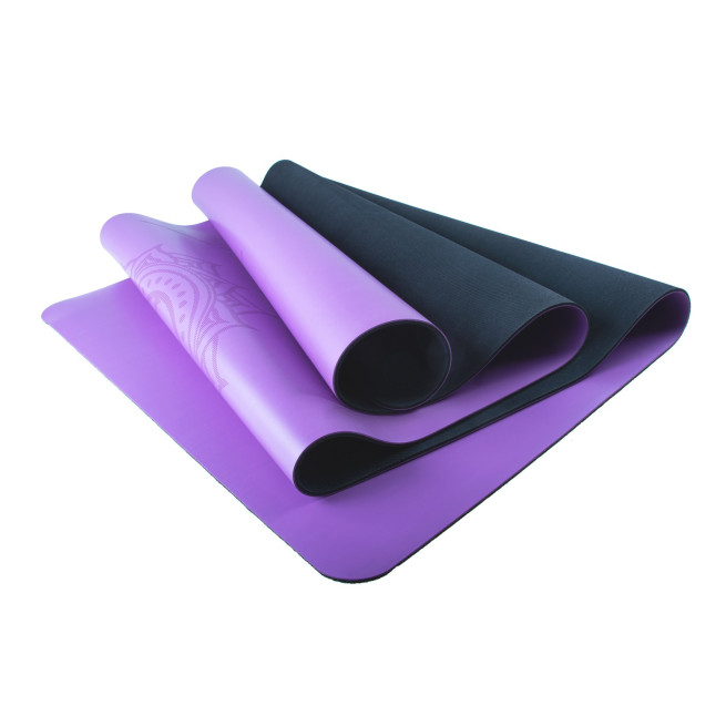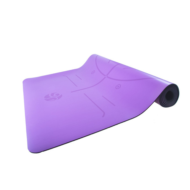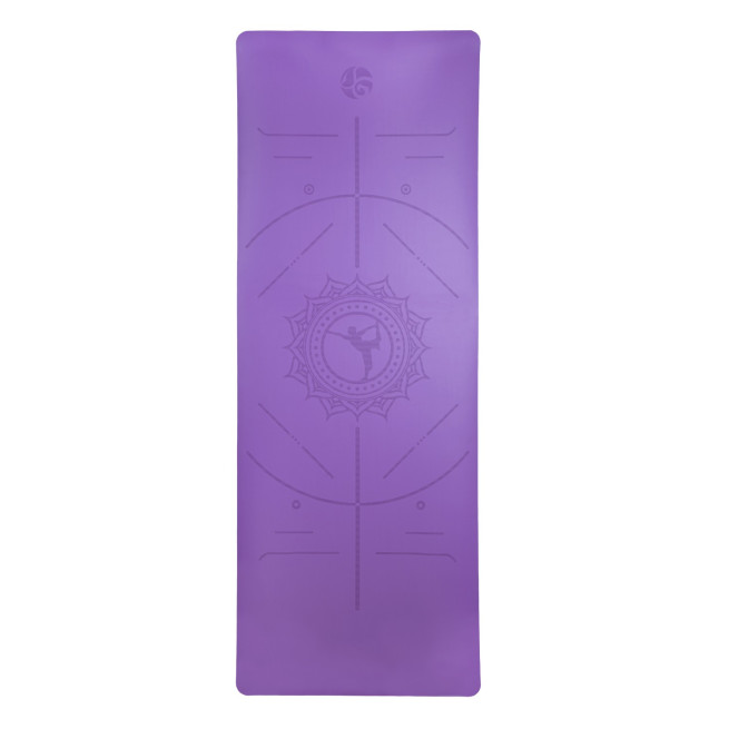Jednobarwna mata została przyozdobiona liniami pomocniczymi, ułatwiającymi praktykę jogi.
