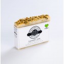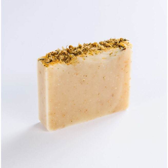 Wierzch mydła przyozdobiliśmy najwyższej jakości koszyczkami rumianku pozyskanego z certyfikowanych polskich upraw ekologicznych.