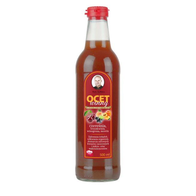Ocet winny czereśnia, brzoskwinia, winogrona, morela to produkt naturalnej fermentacji octowej przygotowany tradycyjnymi metodami. Bez octu spirytusowego, konserwantów i wzmacniaczy smaku. Skład: Sok z czereśni 50%, brzoskwini 30%, winogrona 10%, moreli 10%. W zależności od potrzeb stosujemy do 3 łyżek dziennie octu rozcieńczonego w szklance letniej wody. Nie przekraczać zalecanej dawki dziennej. Wyprodukowano w Polsce.