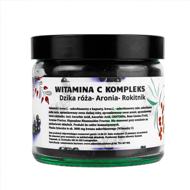 Składniki: kwas L – askorbionowy z kapusty, kwas L – askorbionowy czda, askorbinian sodu czda, sproszkowany owoc dzikiej róży, sproszkowany owoc aronii, sproszkowany owoc rokitnika.
