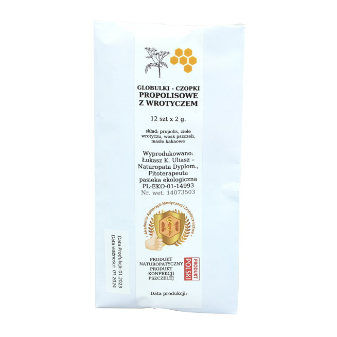 SKŁAD: propolis, ziele wrotyczu, wosk pszczeli, masło kakaowe.