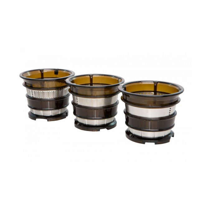 W zestawie znajdują się dwa sitka robocze o różnych wariantach gęstości: do soków klarownych, gęstych, musów lub smoothies i przecierów oraz trzecie sitko homogenizujące do przygotowywania surówek, sorbetów i lodów. Wszystkie sita zostały wykonane z Tritanu oraz wysokiej jakości stali chirurgicznej, dzięki czemu są w zupełności neutralne chemicznie. Sprawia to, że enzymy zawarte w owocach, a także witaminy i antyoksydanty nie utleniają się. Sok wyciśnięty w ten sposób nie traci żadnych właściwości zdrowotnych.