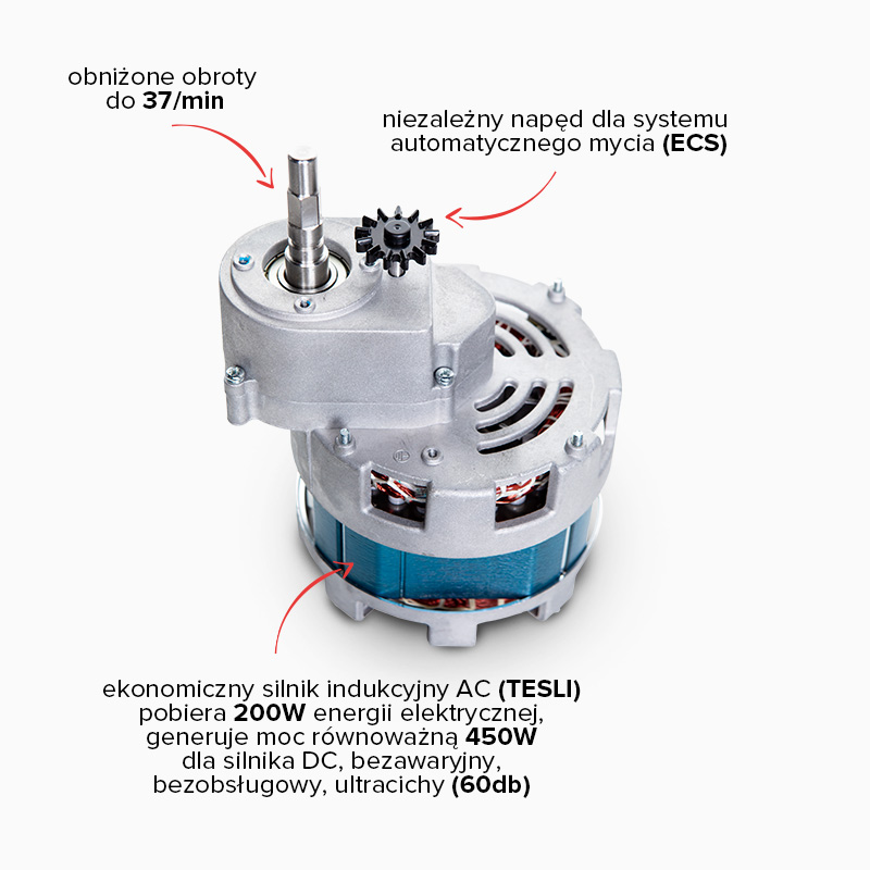 Prędkość wyciskarki została obniżona do 37 obr/min przez zastosowanie nowej przekładni redukcyjnej. Dzięki temu pomimo zaledwie 200 W mocy silnika jednostka napędowa generuje o 20 % wyższą moc efektywną. Teraz nie zdarza się zablokowanie przez twardą marchew, jak to miało miejsce w starszej wersji.