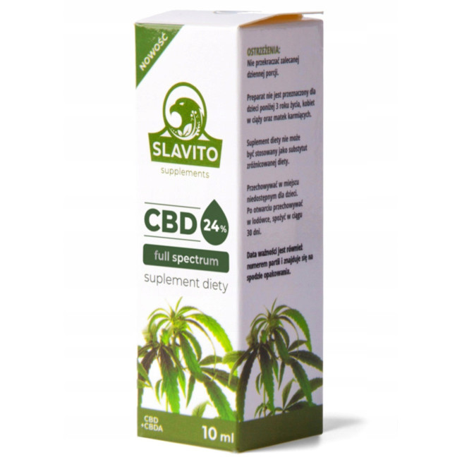 OLEJEK SLAVITO CBD 24% FULL SPEKTRUM to suplement diety, który pozyskiwany jest z nasion konopi i wzbogacony dodatkowo ekstraktem (ekstrakcja etanolowa) z konopi zawierającym całą gamę konnabinoidów. Olejek w każdej kropli zawiera CBD i CBD-A jak również terpeny (działające synergicznie z kannabinoidami) i flawonoidy. Dzięki ekstrakcji etanolowej zachowano pełne spektrum, co ma wpływ na lepsze działanie na organizm i jego układ endokanabinoidowy. Olejki naszej firmy SLAVITO charakteryzuje się wysokim poziomem przyswajalności.