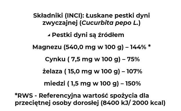 - tzw. super żywność. Pestki dyni, to produkt wielofunkcyjny. Magnez zawarty w pestkach pomaga w prawidłowym funkcjonowaniu układu nerwowego. Natomiast cynk pomaga zachować zdrowe włosy i paznokcie. Żelazo z kolei pomaga w prawidłowym funkcjonowaniu układu odpornościowego oraz w prawidłowej produkcji czerwonych krwinek i hemoglobiny. Przyczynia się także do zmniejszenia uczucia zmęczenia i znużenia. Miedź pomaga w prawidłowym transporcie żelaza. Chroni komórki przed stresem oksydacyjnym oraz przyczynia się do utrzymania prawidłowego metabolizmu energetycznego. Pestki są w 100% naturalne i pochodzą ze sprawdzonych niezmąconych chemią upraw. Są świetnym dodatkiem do Twoich ulubionych potraw i wzbogacą Twoją dietę o nowe smaki (orzechowy – delikatny aromat). Możesz je dodać i tym samym urozmaicić oraz wzbogacić: kanapki, jogurt, zupy, sałatki, owsianki, desery, potrawy z makaronem, upiec z nimi ciasta czy inne wypieki, po zmieleniu z innymi nasionami (np.: konopnymi, dyni, etc) można stworzyć własne pasty humusowe.