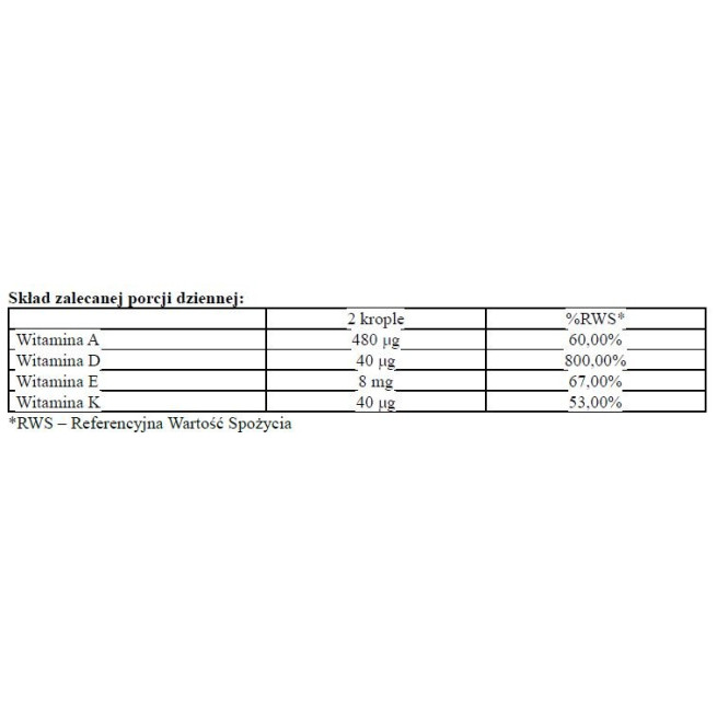 Składniki: oliwa z oliwek, D-alfa tokoferol (witamina E), retinol (witamina A), menachinon (witamina K), cholekalcyferol (witamina D)