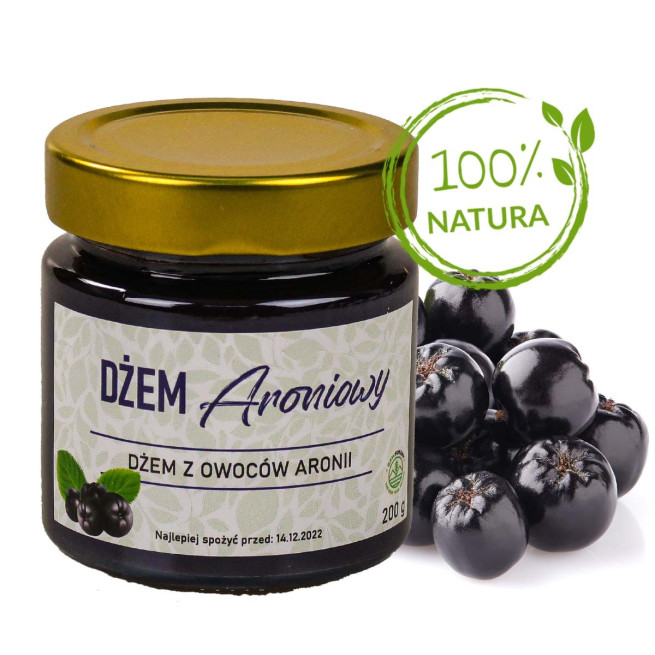 Pełnia smaku i przyjemna konsystencja – to charakteryzuje dżem z owoców aronii. Jego w pełni naturalny skład to także cecha warta uwagi. Nie zawiera żadnych sztucznych substancji konserwujących. Dla zniwelowania lekko cierpkiego smaku owoców aronii użyto cukru trzcinowego. Dżem to zdrowy i smaczny dodatek do kanapek, naleśników, ciast czy lodów – dzięki niemu w smaczny sposób zadbamy o zdrowie naszego organizmu.