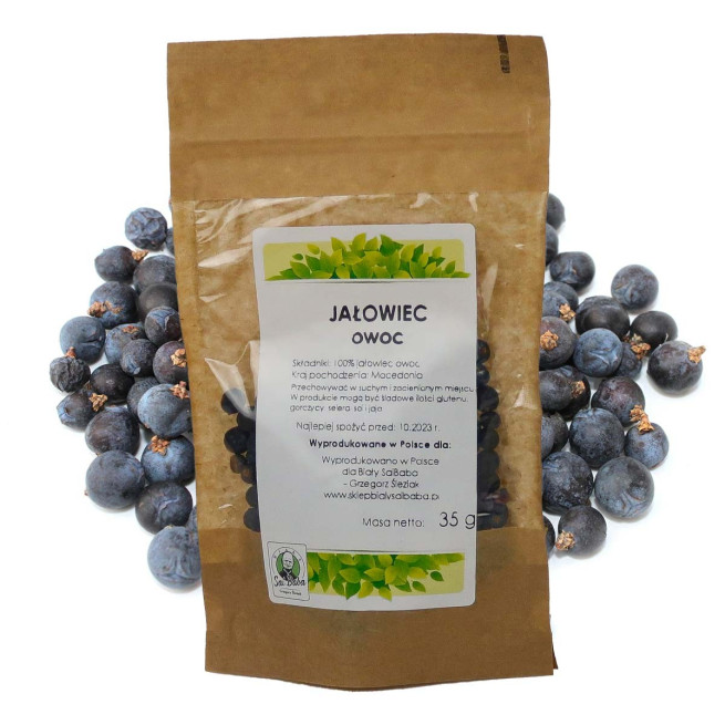Jałowiec pospolity to krzew, który występuje w wielu odmianach. Ma szpilkowate liście i małe, podłużne, żółte kwiaty. Jego dojrzałe owoce (szyszkojagody) są granatowoczarnego koloru. I to właśnie je wykorzystuje się jako przyprawę oraz surowiec zielarski w ziołolecznictwie (jako środek moczopędny, poprawiający perystaltykę jelit i hamujący wydzielanie gazów).
