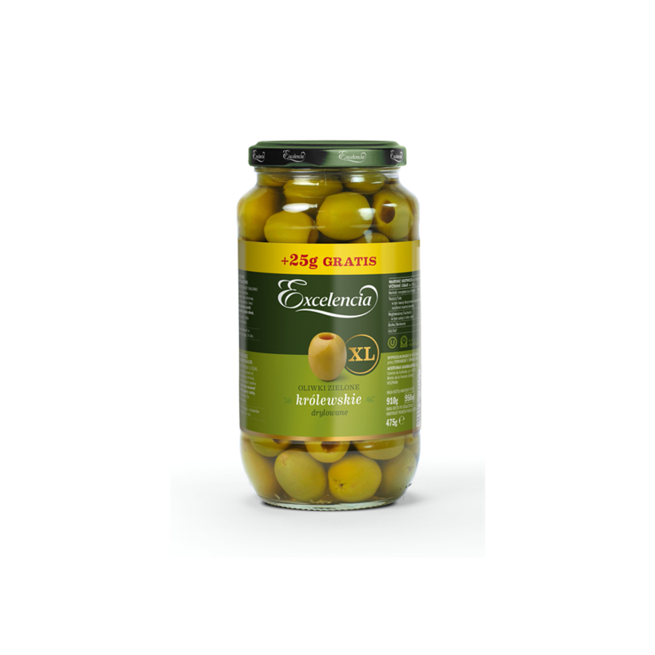 Oliwki zielone królewskie XL, drylowane w zalewie z dodatkiem soli morskiej. Oliwki Gordal to najszlachetniejsze z oliwek. Ich jakość podkreśla ręczny zbiór w rejonie Sevilli. Śródziemnomorskie słońce nadaje im łagodny, owocowy smak oraz świeży bukiet. Bez dodatku GMO i pestycydów. Posiadają certyfikat Koszerności oraz Halal. Doskonale nadają się jako przekąska, przystawka lub idealne wykończenie Martini.
