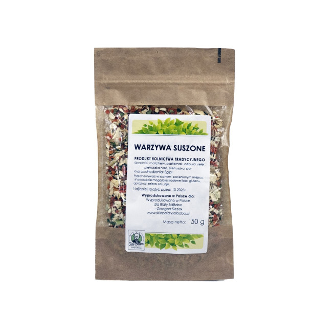 Warzywa suszone to mieszanka zawierająca: marchew, pasternak, cebulę, seler, natkę pietruszki, por. Jest to zdrowa alternatywa wobec kostki rosołowej, ponieważ ma same naturalne składniki – bez dodatku soli, sztucznych konserwantów czy glutaminianu sodu.